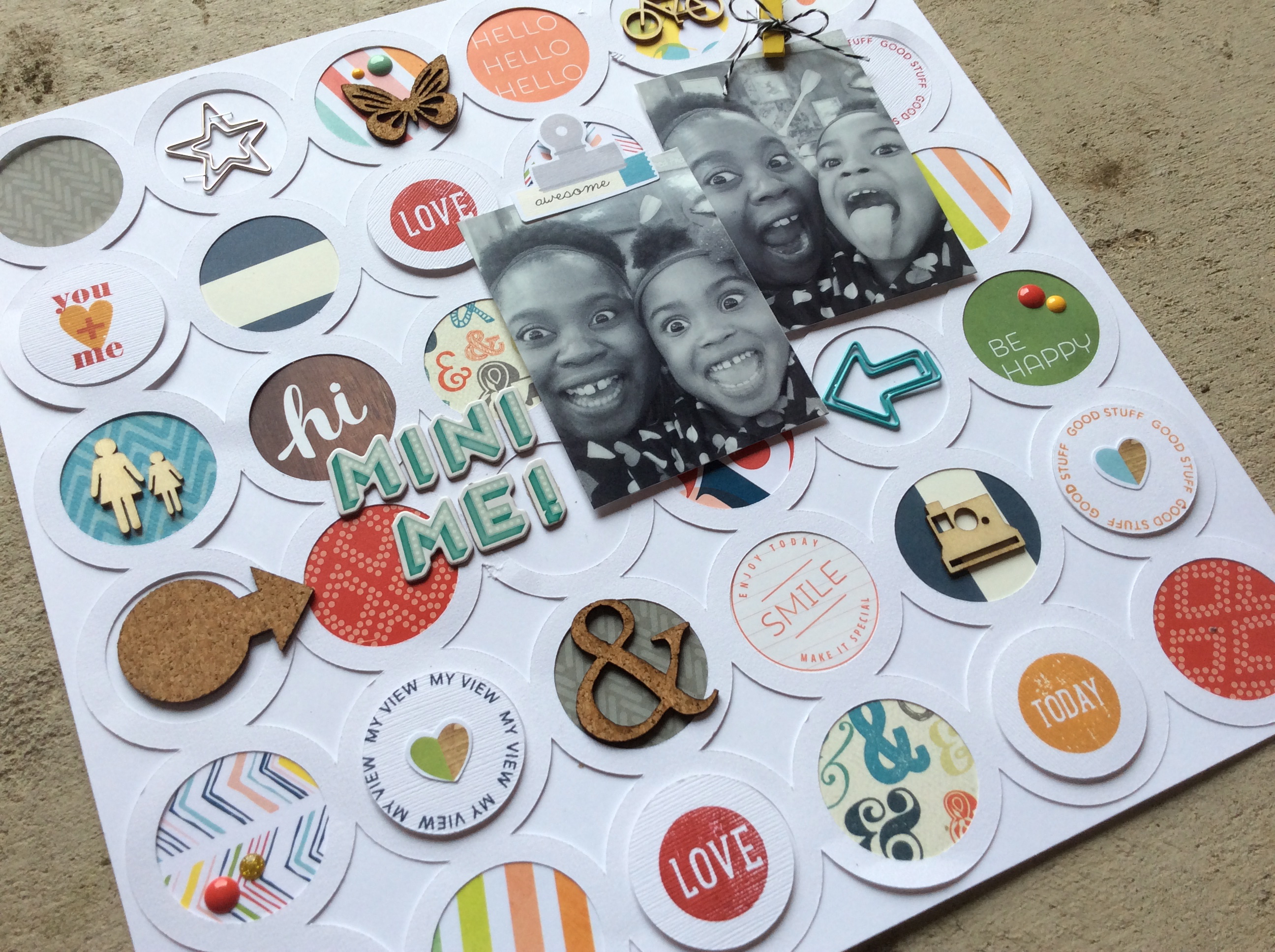 I have such a hard time using shapes on my layouts. So I pulled out my Silhouette Cameo and found this circle die cut. My thought was to back the die cut circles with various pattern papers then embellish with wood veneers, chip board, stamping, and enamel dots. The result? Amazing!!!!