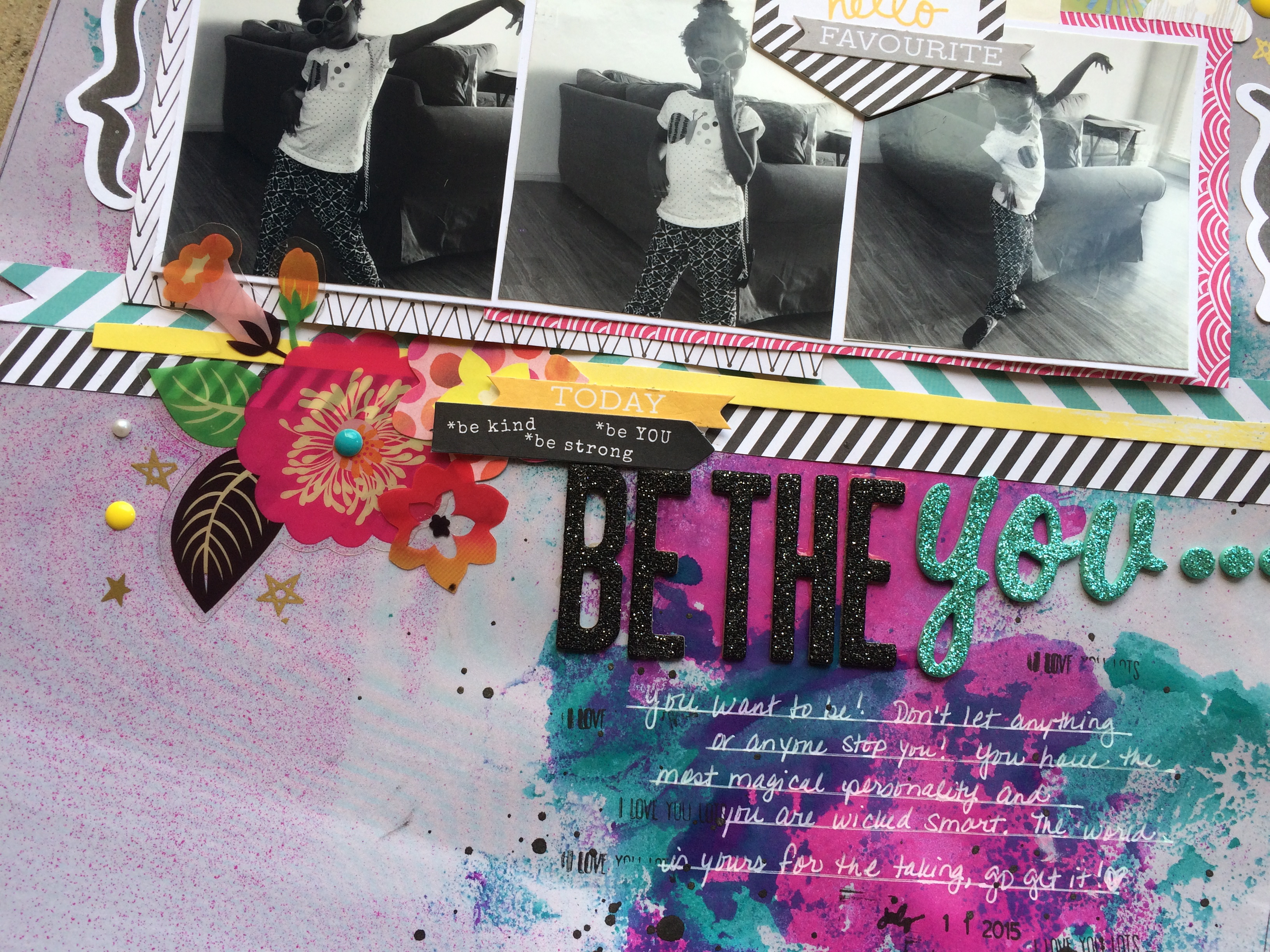To be honest, I struggle with using mixed. I am a very linear scrapbooker and enjoy clean lines and simple designs. However, there is something that draws me into a layout that is messy with lots of colors and textures. I know somewhere in my Type A brain is a mixed media goddess!