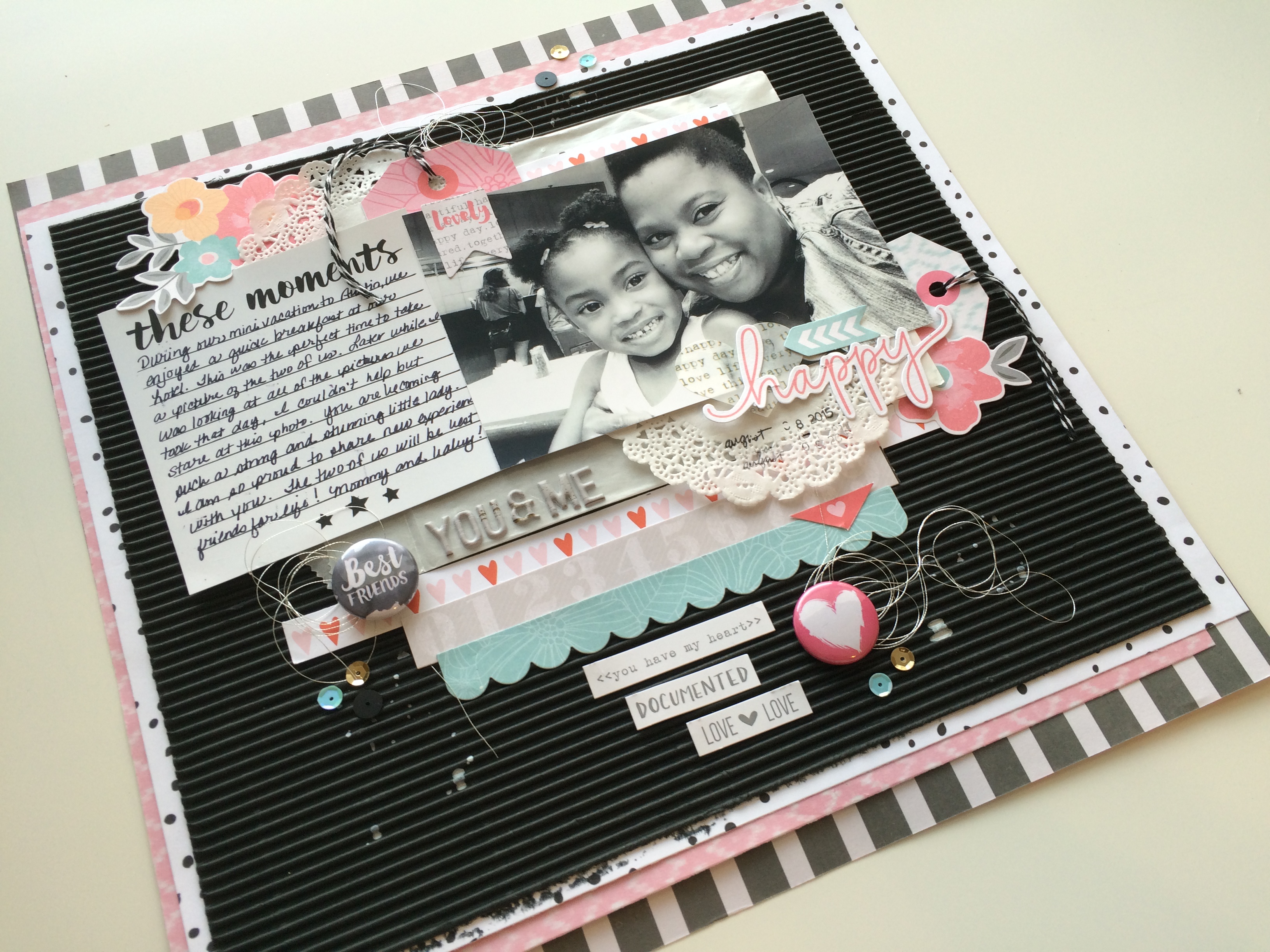 I decided to create a layered look for both the base of the layout and the around the photo. For the base, I used three patterned papers, Lucky Dip and Flower Patch from the Hello Lovely collection by Cocoa Vanilla, and Baxter by Sever Paper. I mounted my photo on a glassine bag (which contained some of my Clique Kit goodies) and layer a fun assortment of die cuts, stickers, and tags from the Hello Lovely collection by Cocoa Vanilla and the Cienna collection by Elle’s Studio around my photo. I adhered all of this on the black corrugated paper from Fancy Pants Designs.