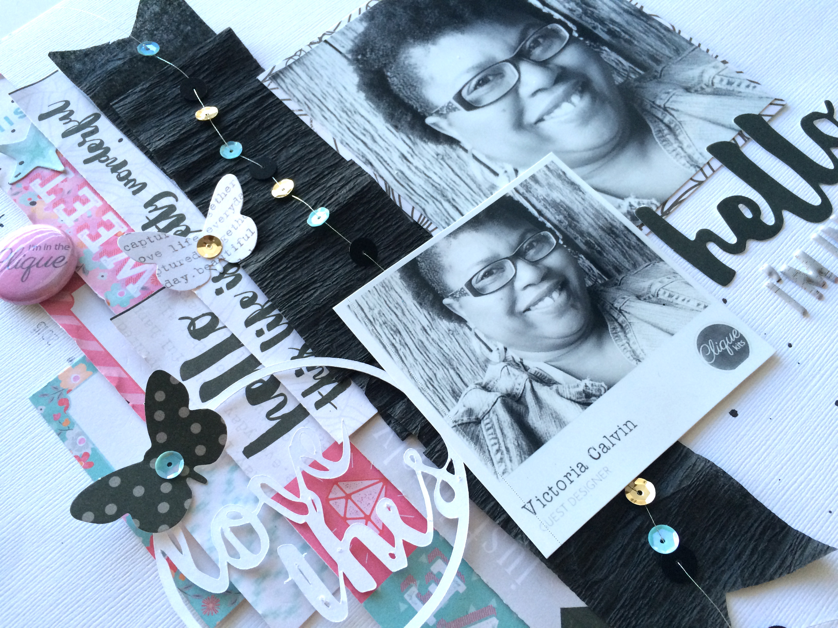 The kit included papers and embellishments from the Cocoa Vanilla Hello Lovely collection. One of the papers included several cut aparts which I layered on the side of the layout. I added an exclusive flare that was given to me by the wonderful folks at Clique Kits which also served as the inspiration for my title. The title features a die cut “hello” and gray puffy font stickers from Evalicious. I added the Kal Barteski pink font by Thickers from my stash. I finished the layout with a few butterfly die cuts from Cocoa Vanilla and black mist from Heidi Swapp.