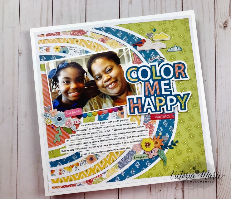 Today, I am using the Color Me Happy cut file bundle. This bundle includes 15 images, available as both a SVG and PNG file. To see this layout come together, be sure to visit the Victoria Marie YouTube Channel!