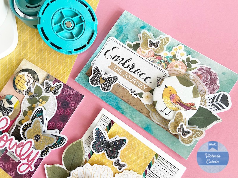 For the third card, I created a large button that features a precious little bird from the Storyteller Songbird pattern paper. The die tool included with the Button Press made it easy cut this image! This large button was adhered to the right side of the card and layered on top of die cuts from the Storyteller Collection.