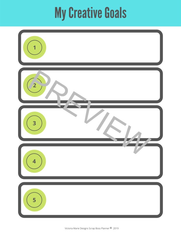 My Creative Goals: A space to list your top creative goals for the year. Focus on making your scrappy goals smart and doable!