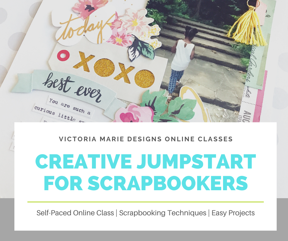 Creative Jumpstart for Scrapbookers by Victoria Marie Online Classes, is a self-paced, 6-week online course designed for those who are looking for creative inspiration, want to deep dive into some of the most popular scrapbooking techniques, and use the skills learned in this course to create stunning scrapbook projects!