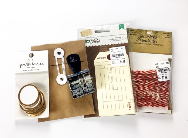 I created a tag using a piece of woodgrain pattern paper from the kit and a We R Memory Keepers Tag Punch Board and Reinforcer Hole Punch.
