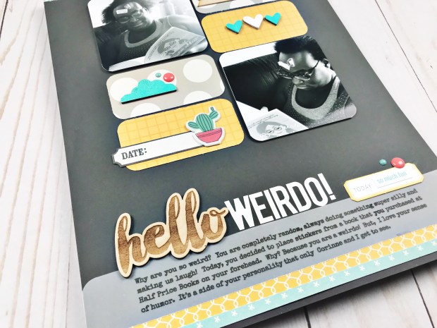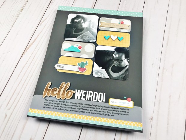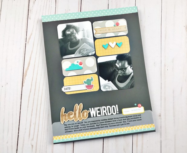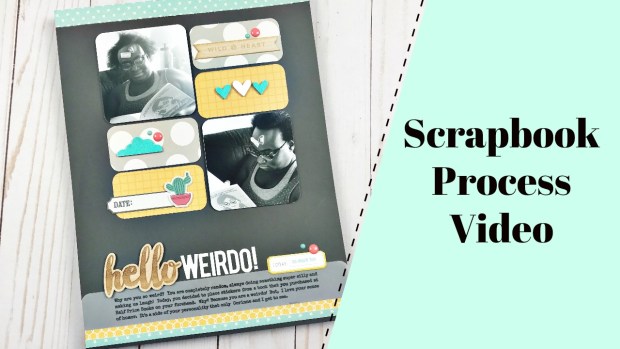 I’m back with another scrapbook process video, featuring a clean and simple grid layout called “Hello Weirdo”! Over the past few months, I have been really focused on using items from my stash. Each element on this page has lived in my stash for months (years even) and it was time to use them up!