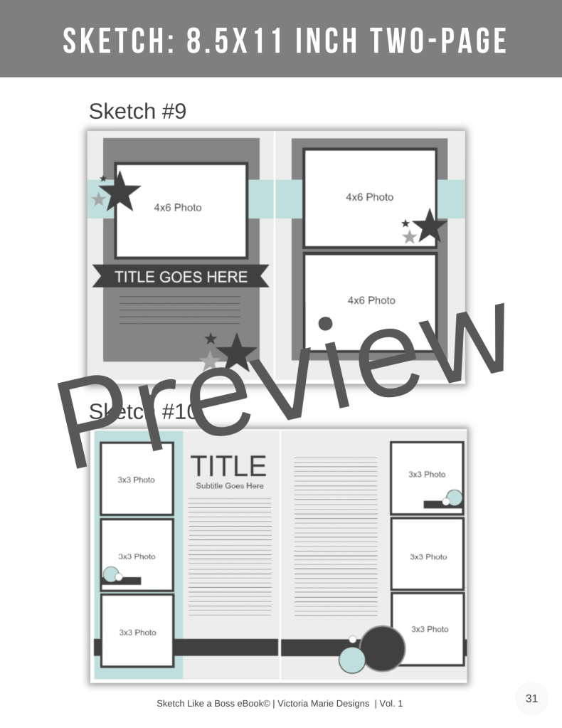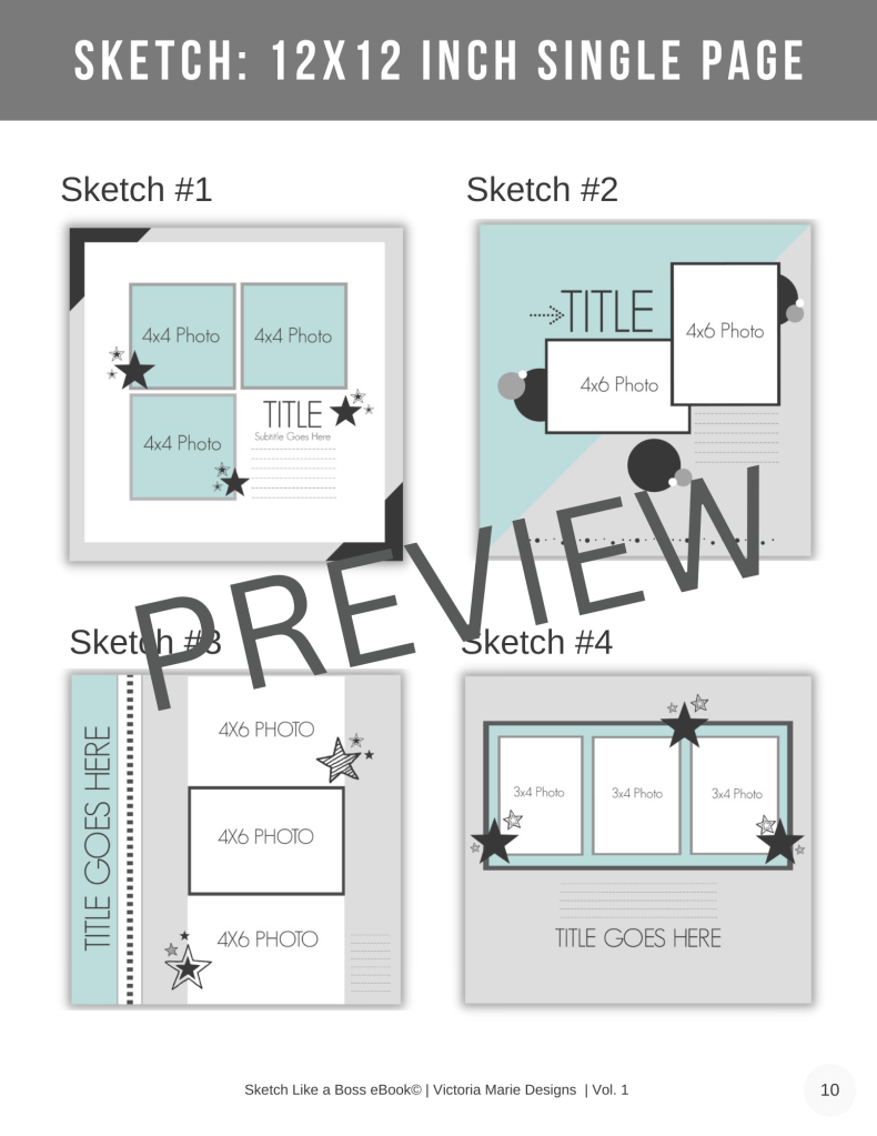 The Sketch Like a Boss eBook features 50 scrapbook sketches to include 8.5 x11 inch and 12×12 inch single and double page sketches. All of the sketches are easy to use and flexible based on your scrapbooking style! This full color digital ebook also includes tips and recommendations for using scrapbook sketches and Bonus Project Inspiration layouts using some of the sketches in this ebook.