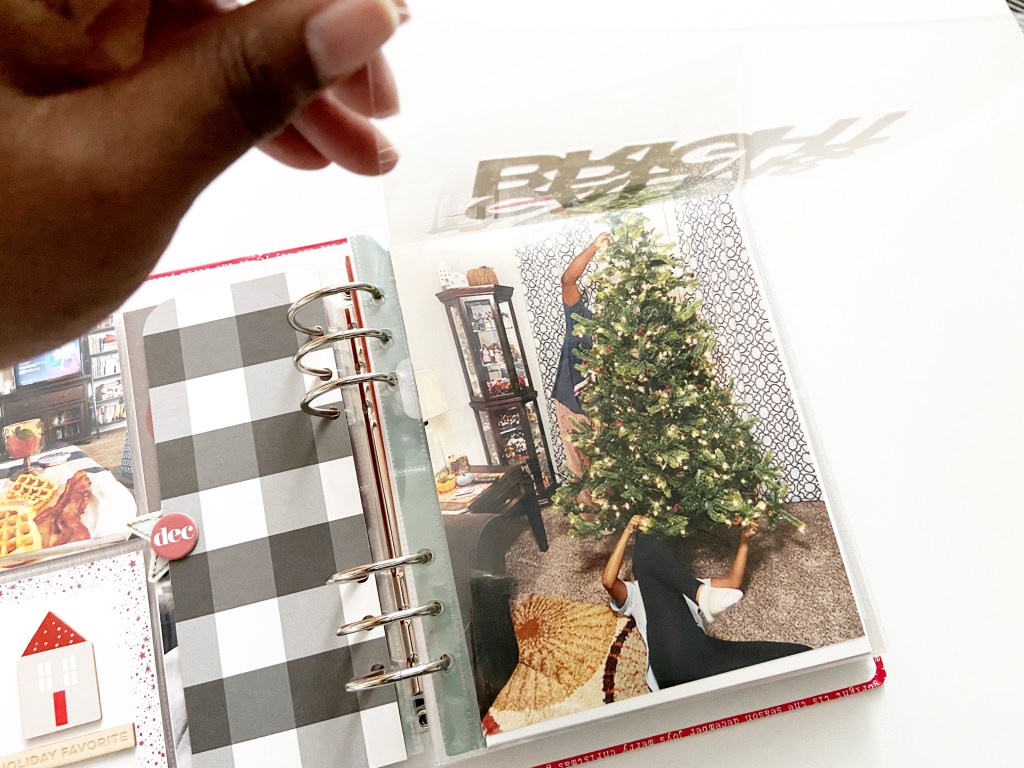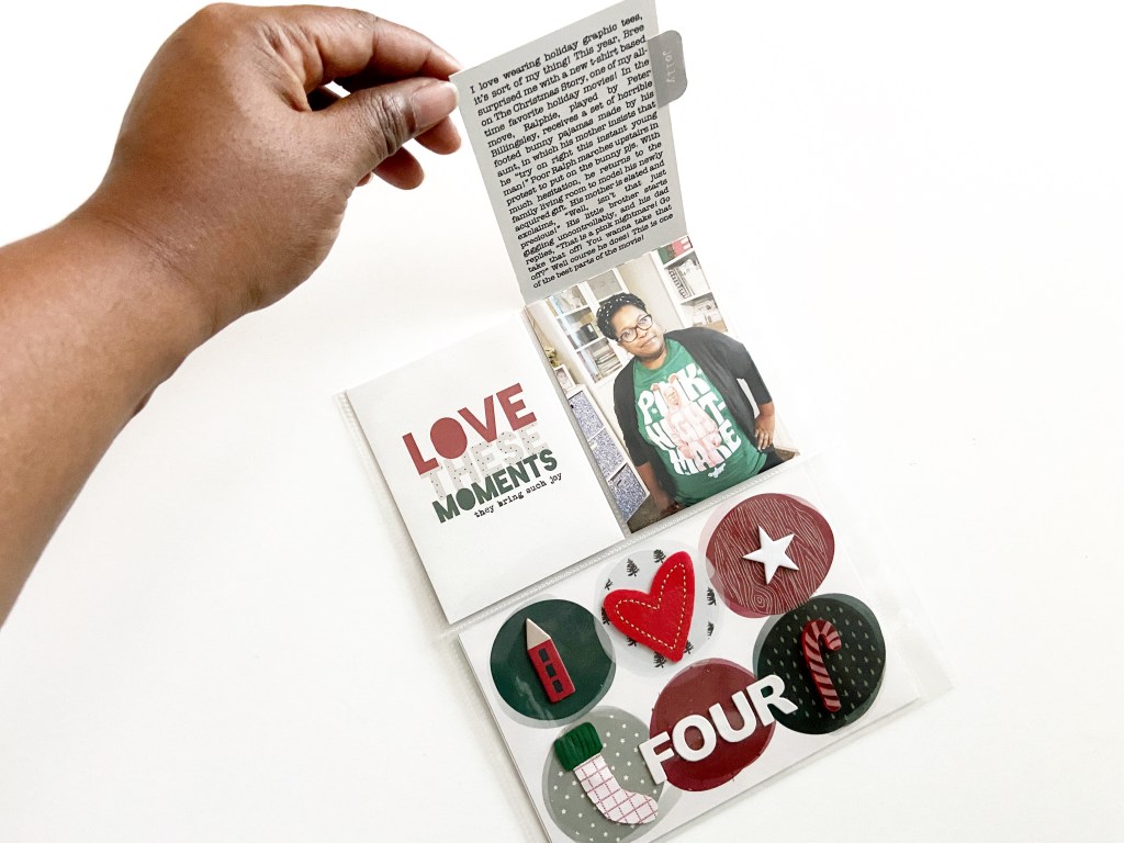 Story #2: Decorating the Tree – Decorating the Christmas tree is always an eventful task when my spouse and kid are involved! For this layout, I created an interactive element using acetate. The acetate cover flips up to reveal a 6×8 inch photo of my spouse and daughter hiding behind and under our Christmas tree as I say, “Hey, let’s take a photo.” They are jerks!