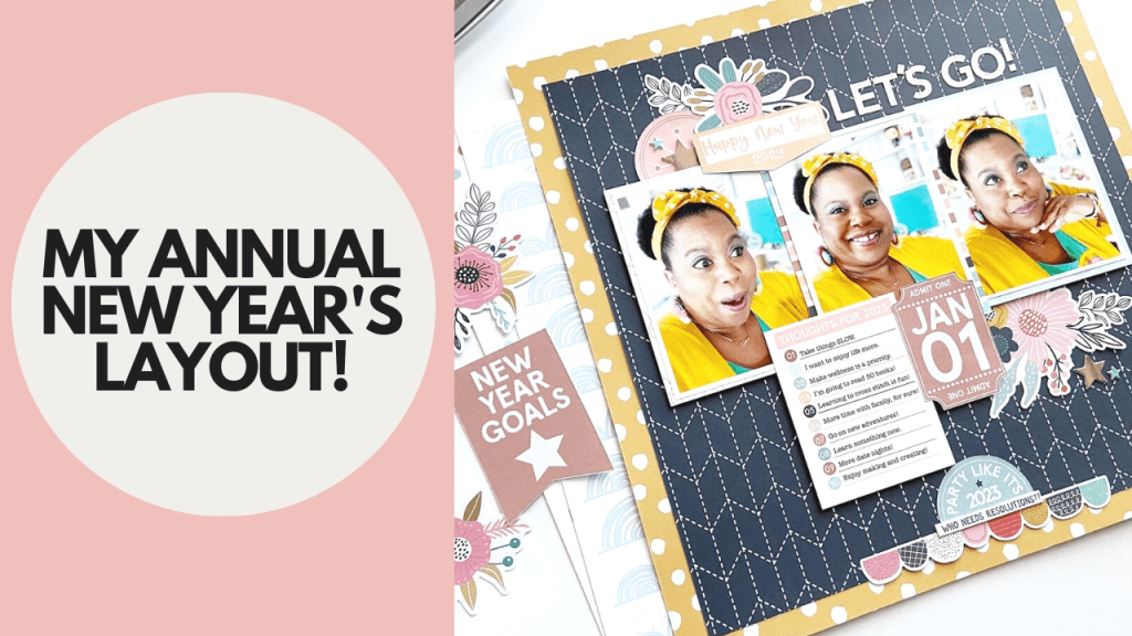 At the beginning of each year, I make an annual New Year’s scrapbook layout. I started this tradition several years ago and consider it to be an important part of my scrapbooking journey. This project serves as a jumping off point for my storytelling adventures and a declaration of what I hope for in the coming year.