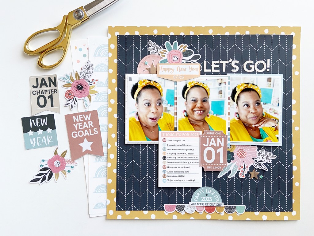 Next, I looked for New Year’s themed products in my stash…of which I had NONE! So, I grabbed a digital kit from The Cut Shoppe and paired that with pattern papers and embellishments from the December 2022 Hip Kit Club main kit and embellishment kit. The color story in both collections coordinate perfectly to create a cohesive spread!