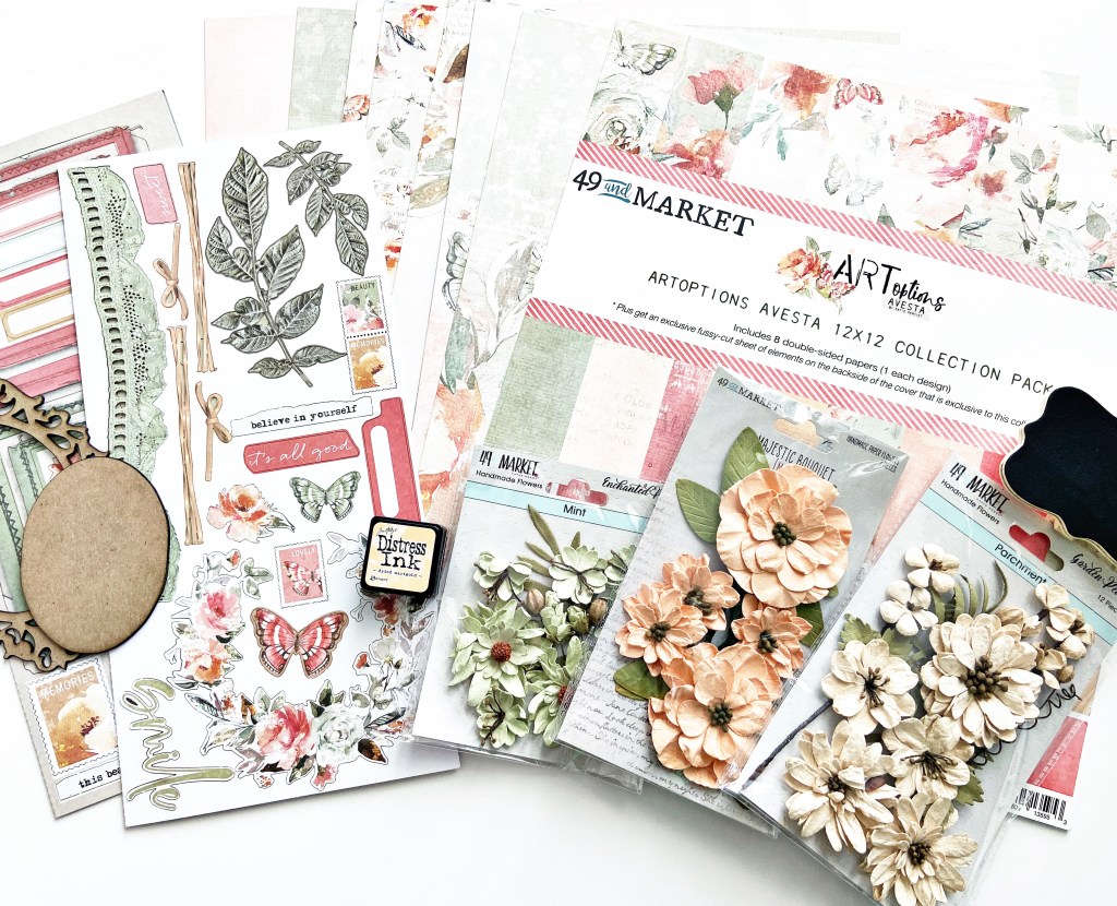 After learning more about Tres Jolie, I was super excited to purchase a kit! In fact, Tres Jolie offers a variety of kits to include scrapbooking, mixed media, and card kits. I purchased the April 2022 Scrapbooking Kit and upon opening the kit, I knew I was in for a treat!