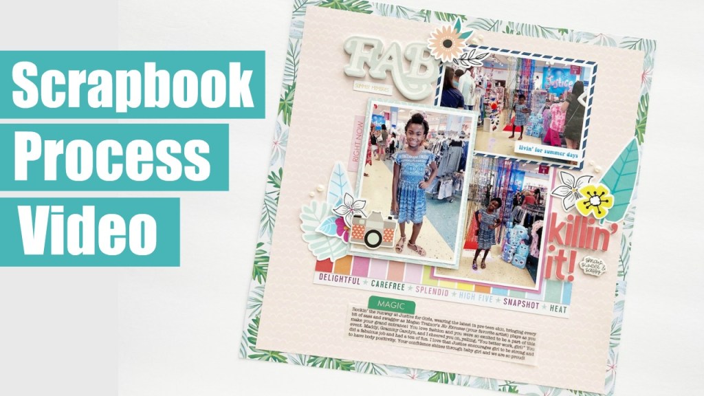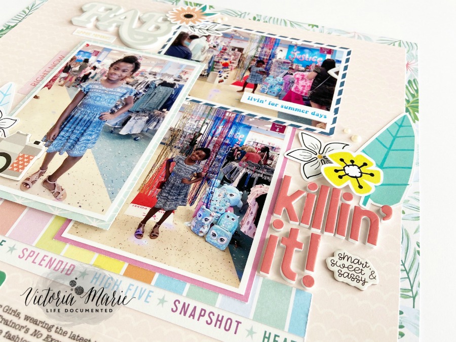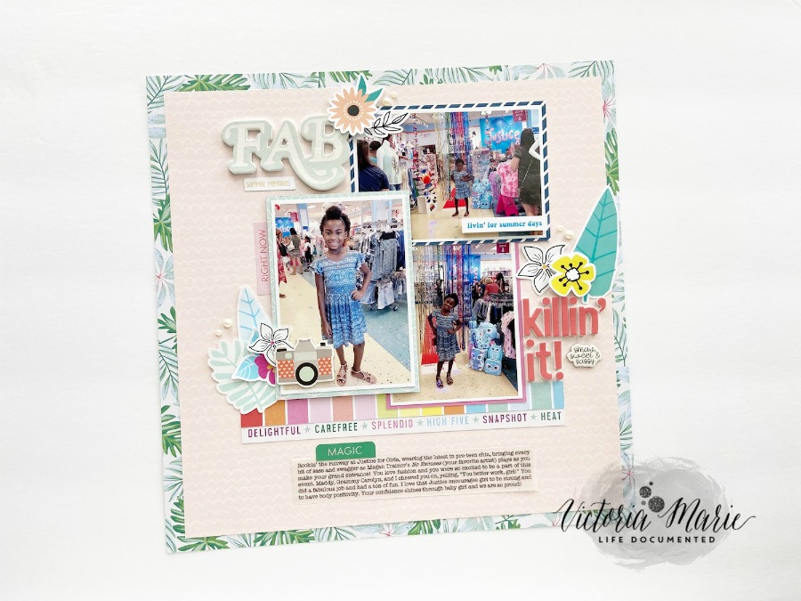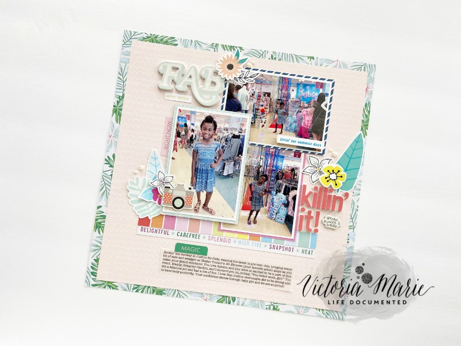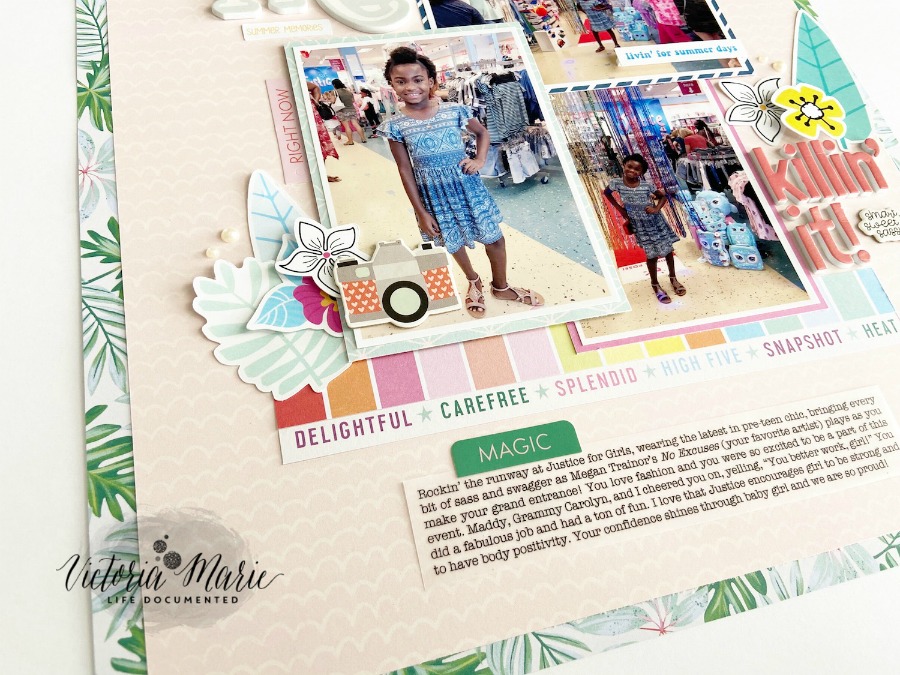 This 12 x 12 inch layout features a story about my daughter, who in 2018, participated in a summer fashion show at a tween clothing store called Justice for Girls. She was so excited to get dressed up and walk the runway!