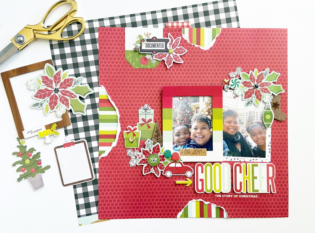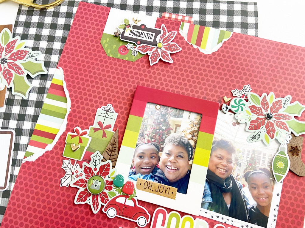 During the livestream, I struggled to find a spot for my title and journaling. So, I decided to use the “Good Cheer” foam stickers for my title, positioned under my 3×4 inch photos. And I created a hidden journaling pocket on the back of my layout for my journaling. There is a solution for most problems!